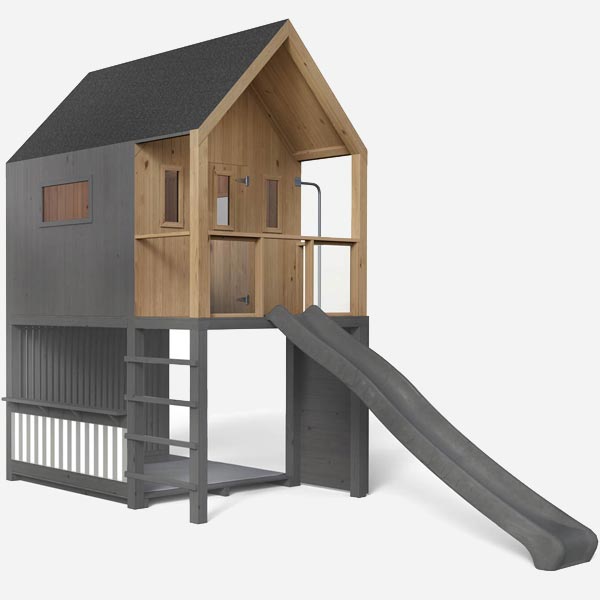 ✔️ Gradliniges Design - 1,50m Podesthöhe✔️ Kaufladen mit grauen Planenstoff✔️ 3 m lange graue Wellenrutsche✔️ Stabilität durch 9x9 cm Stelzen✔️ Raumhöhe von 2,10 m✔️ inkl. Bodenanker
