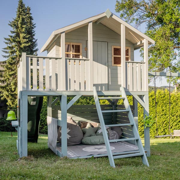 Dank der Kletterwand mit bunten Klettersteinen ist das Stelzenhaus auch ein Kletterturm, an dem kleine Entdeckerinnen und Entdecker neue Bewegungen lernen können. Auch kleinere Kinder können unsere Stelzenhäuser über die Treppe bzw. Kletterleiter erreichen. Nachdem das Stelzenhaus mit Balkon erobert wurde, können die Kinder über die Rutsche ganz schnell wieder nach unten gehen, um im Sandkasten Sandburgen zu bauen, um im Sandkasten Sandburgen zu bauen oder in der Kids Lounge zu "chillen". Auf der stabilen Schaukel haben zwei Kinder gleichzeitig Platz zum Schaukeln. So wird aus einem Stelzenhaus ganz schnell ein ganzer Spielplatz.
