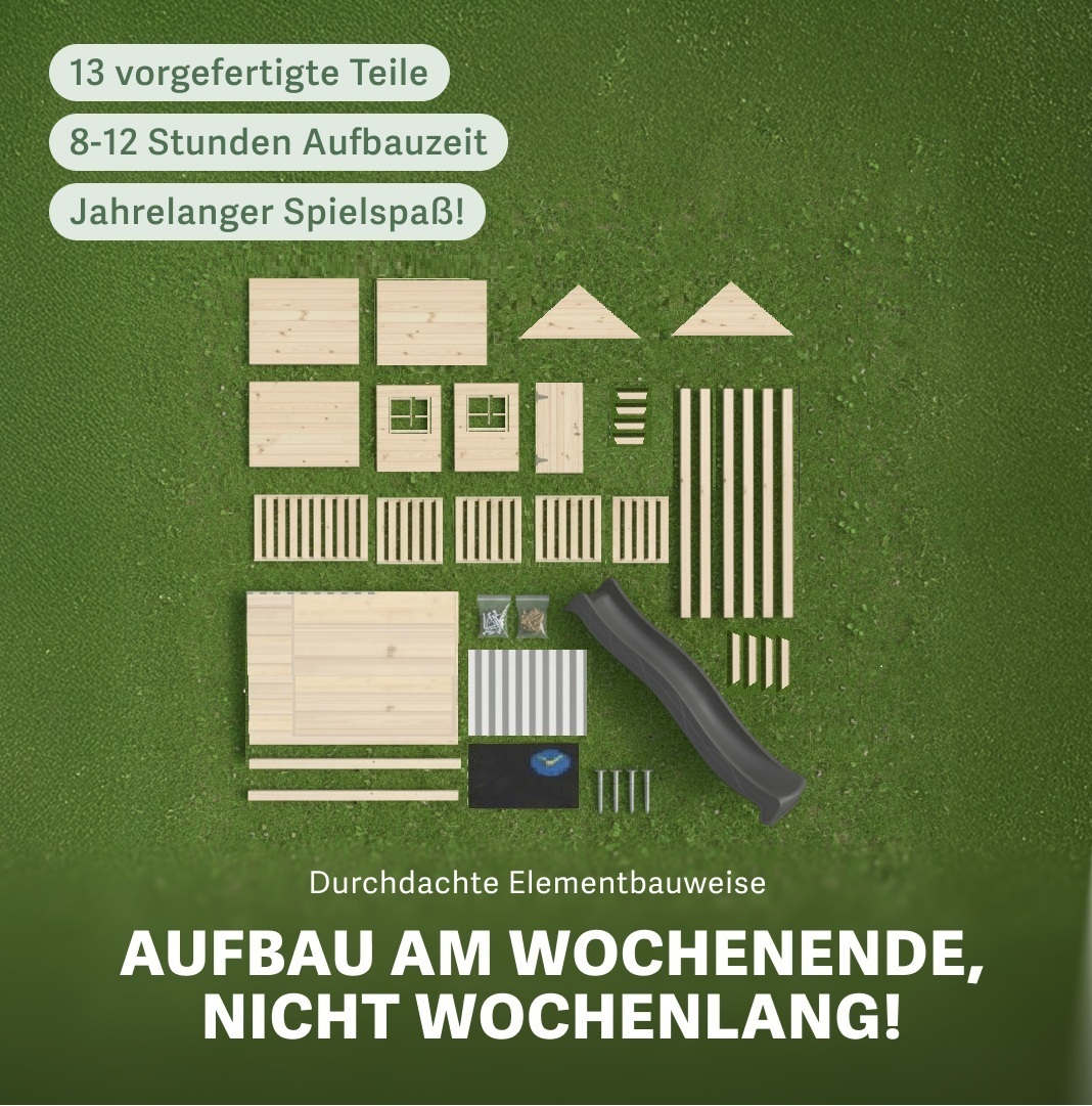 Die Elementbauweise mit werkseitig vorgefertigten Teilen erleichtert den Aufbau erheblich. 5 Wand-, 2 Giebel-, 1 Tür-, 6 Balkon-, 2 Treppenelemente sind vorgefertigt. Das ist bei Spielhäusern keine Selbstverständlichkeit und führt zur Frage: Baust du noch oder spielst du schon?
