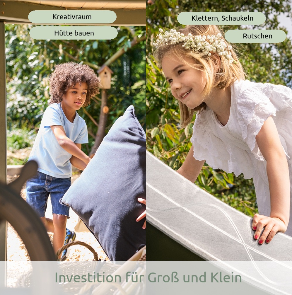 Ob klettern, rutschen, schaukeln, malen, entdecken oder Kaufmannsladen spielen – hier ist alles möglich! Der schlichte, moderne Stil fügt sich harmonisch in jeden Garten ein, während Kinder nach Herzenslust draußen spielen, toben und ihre Fantasie entfalten können.
