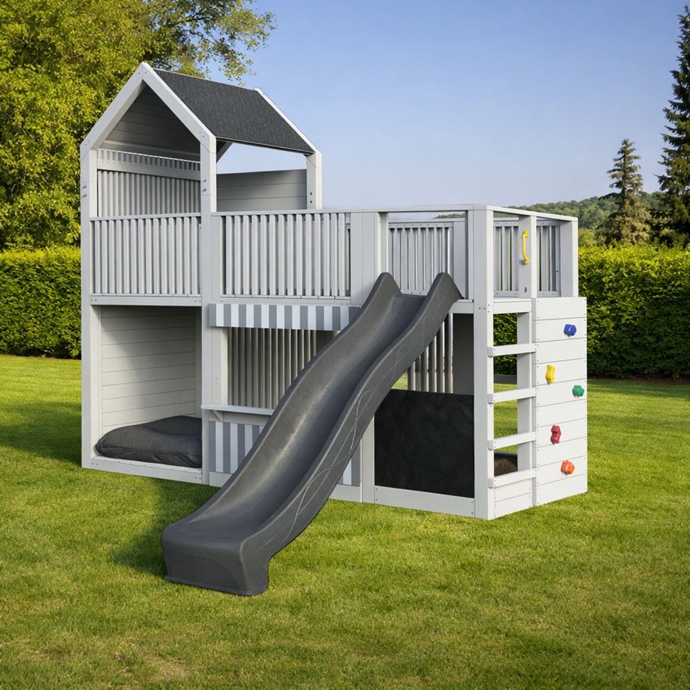 Auf zwei überdachten Spielebenen können sie klettern, rutschen, malen oder sich im Kaufladen ausprobieren. Jedes Detail wurde mit Blick auf Spielwert, Sicherheit und Langlebigkeit entwickelt.
