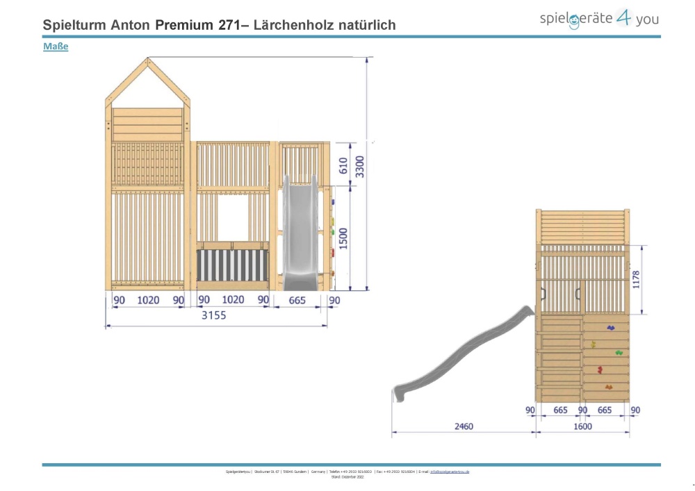 Der Spielturm Anton – Premium 271 ist ein kompletter Spielgerätebausatz aus massiv FSC-zertifizierter europäischer Lärche. Mit hochwertigen Massivholzbauteilen, wetterfesten Holzdächern, umfangreichem Montagematerial, vielseitigem Spielgerätezubehör und einer ausführlichen Aufbauanleitung bietet dieser Spielturm alles, was Kinderherzen höherschlagen lässt.