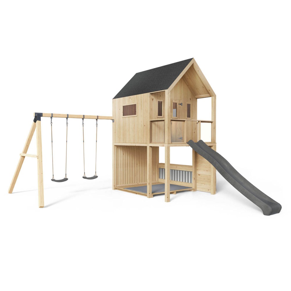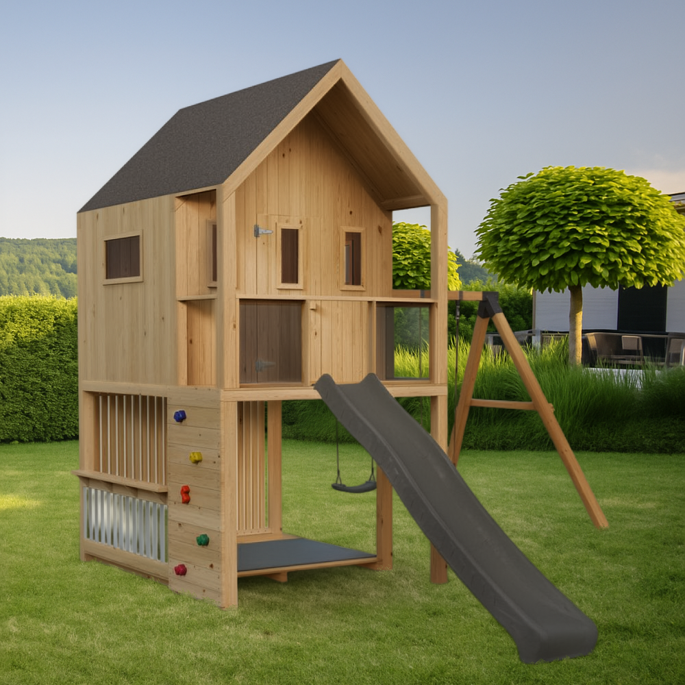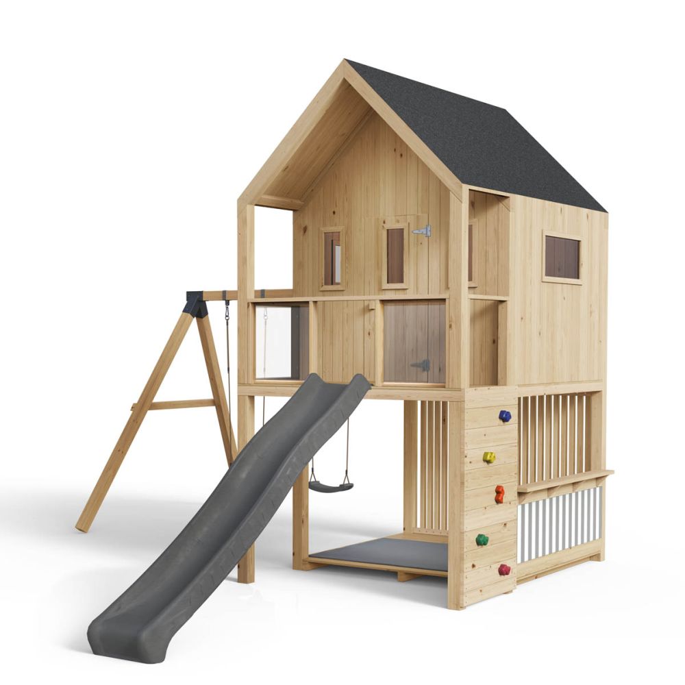 Entdecken Sie unser modernes Spielhaus auf Stelzen, das mit seinem gradlinigen und innovativen Design nicht nur optisch begeistert, sondern auch für unvergesslichen Spielspaß sorgt! Mit einer Podesthöhe von 1,50 m und einer großzügigen Raumhöhe von 2,20 m bietet dieses Spielhaus ausreichend Platz für Kinder jeden Alters – sogar für die Großen.