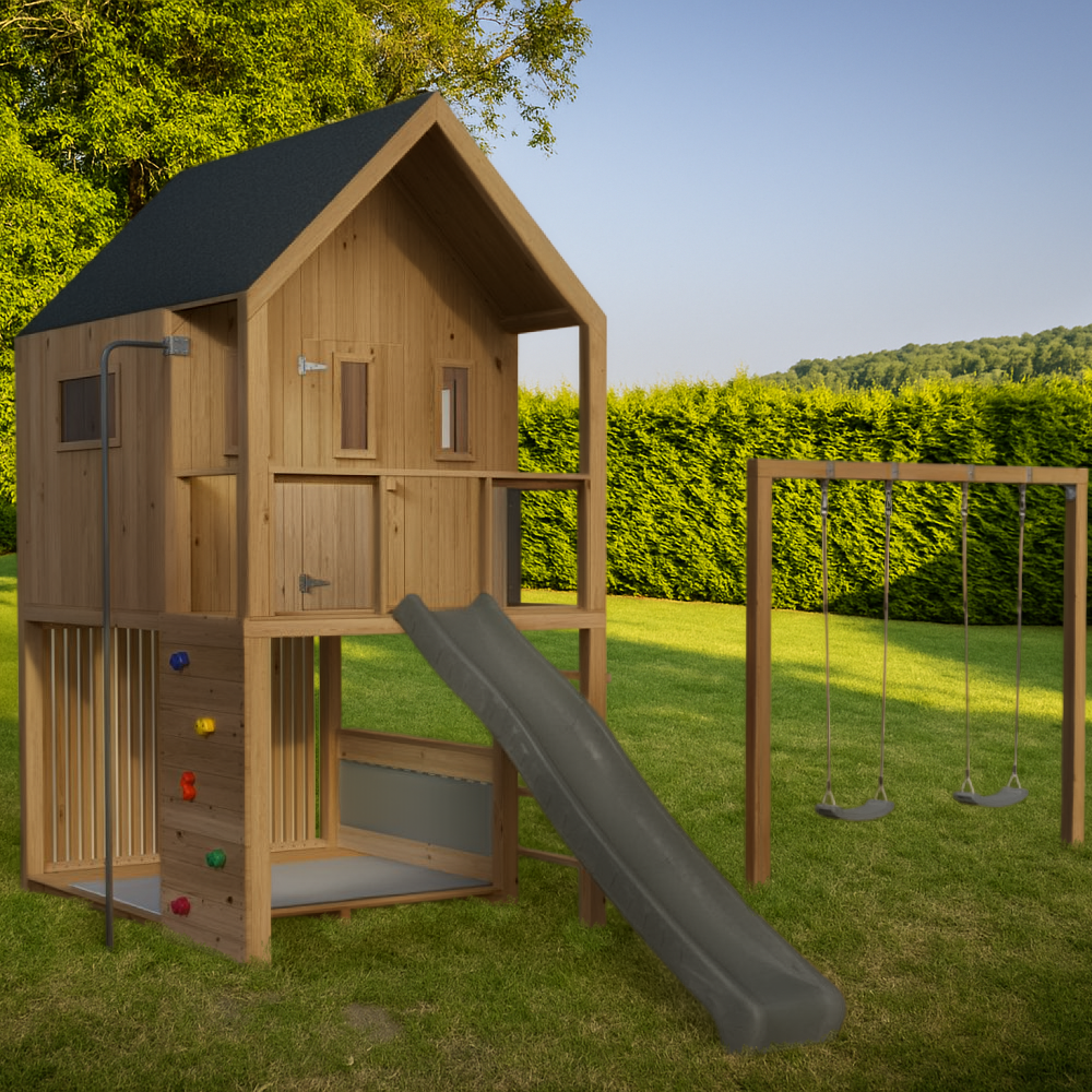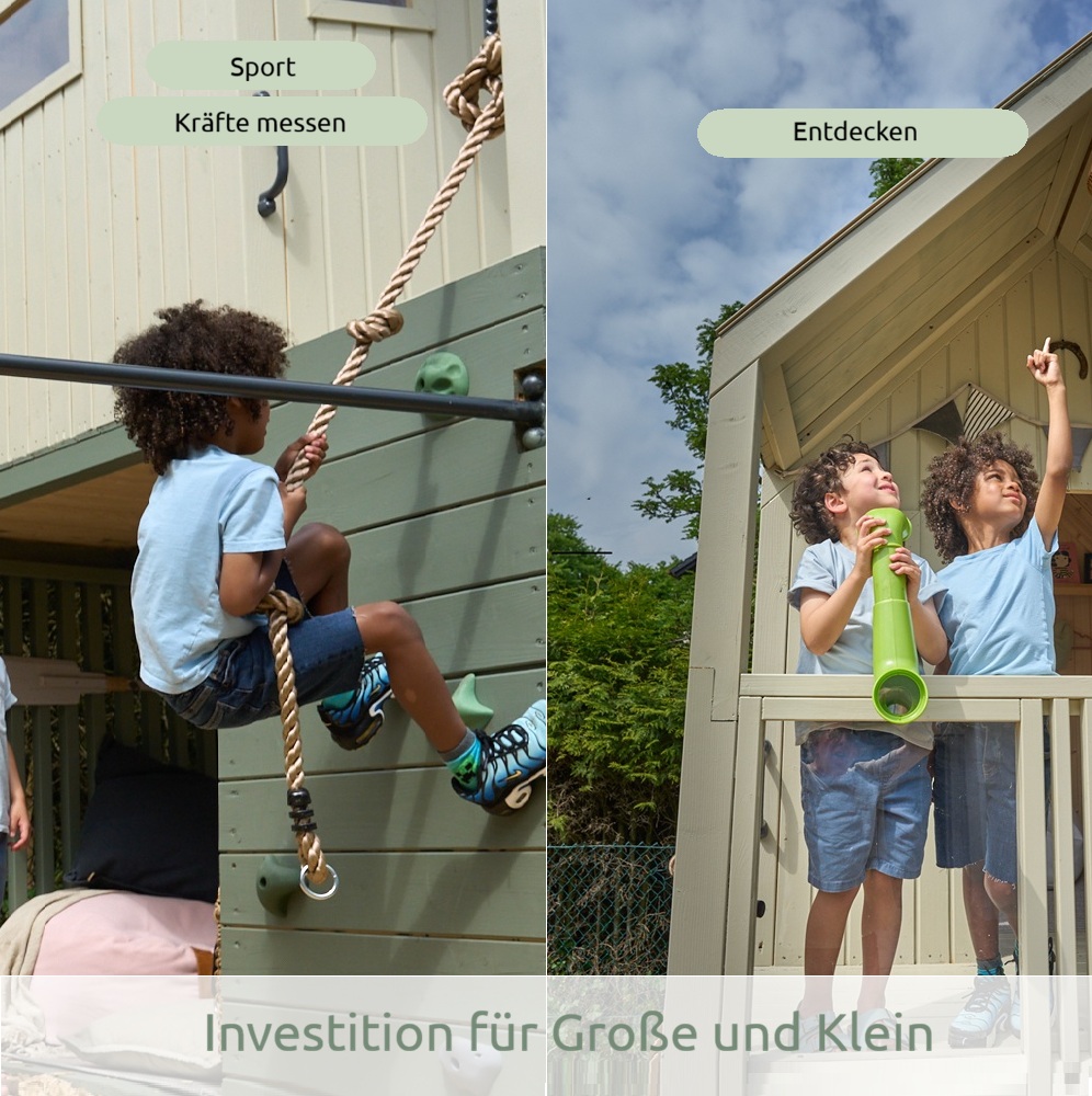 Das Stelzenhaus überzeugt mit seinem modernen, gradlinigen Design ohne unnötige Schnörkel und fügt sich harmonisch in jeden Garten ein. Es bietet zahlreiche Spielmöglichkeiten, die Kinder begeistern werden. Ob beim Klettern an der robusten Kletterstange, beim Spielen im Kaufladen, Entspannen in der gemütlichen Lounge oder beim Entdecken des Podests im Haus und auf der Veranda – Langeweile wird hier garantiert nicht aufkommen!