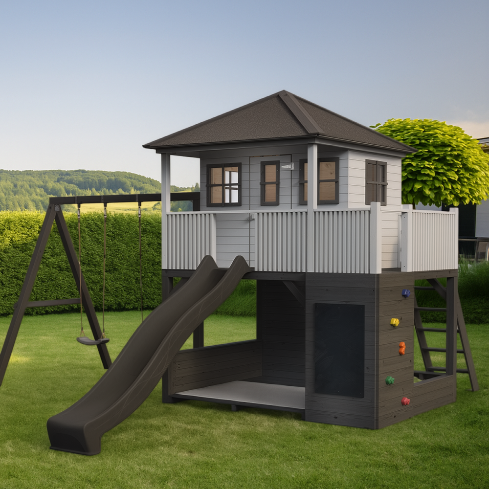 - Loungeboden, Kletterwand, seitlicher Veranda, Doppelschaukel