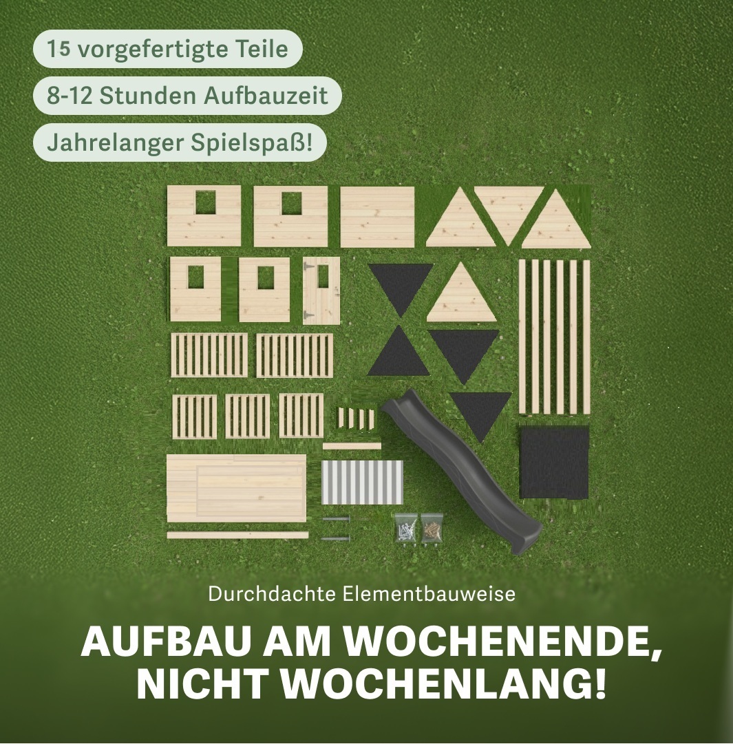Stelzenhaus Frieda 834 auf den Punkt gebracht: Entwickelt in Deutschland nach EN-1176 + naturbelassenes Massivholz + stabile Konstruktion + schnörkelloses Design + hoher Spielwert + leichter Aufbau durch vorgefertigte Bauteile + sehr gute Beratung + sicherer Transport + passende Bodenanker + Dachpappe + nachhaltiger Holzschutz + einfache Wartung.