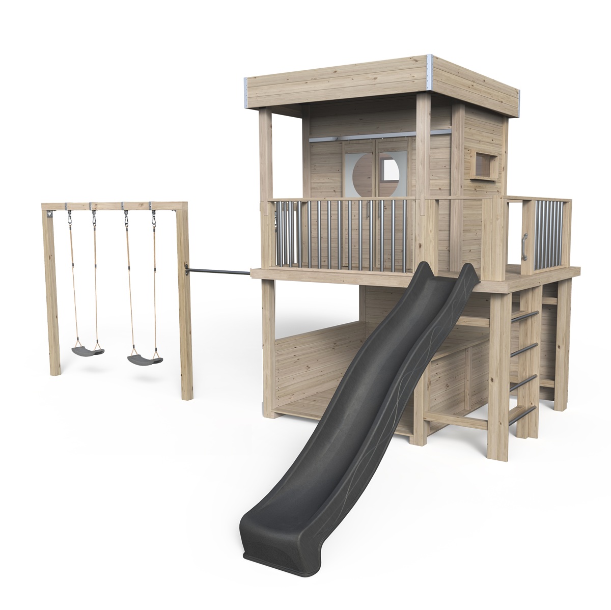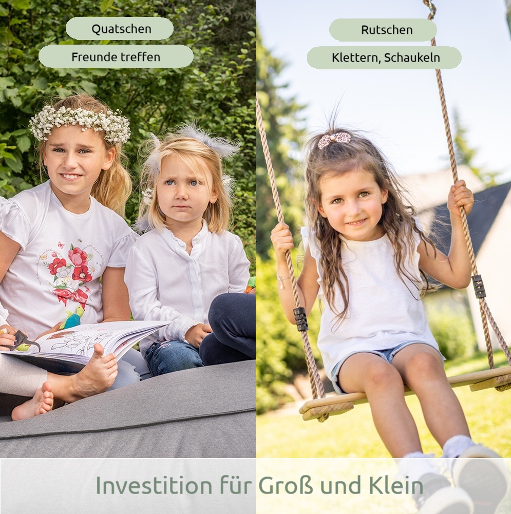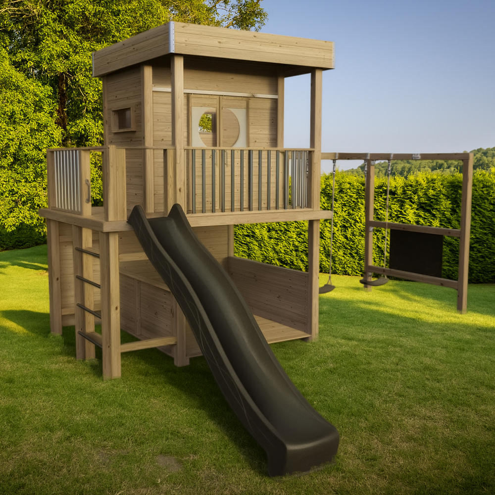 Welches Spielhaus würden Ihre Kinder wählen? Wahrscheinlich ein großes, hoch wie ein Baumhaus, mit Schaukel, Rutsche Kletterwand und Lounge.