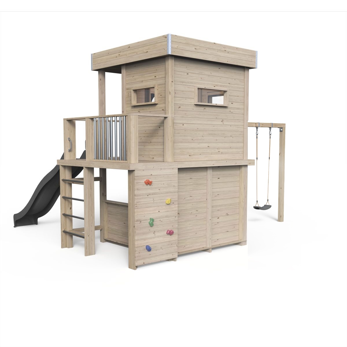 Im Sand buddeln, schaukeln, klettern, rutschen, chillen, malen alles ist möglich. Das Spielhaus Karl ist eine komplette Kinderspielwelt im eigenen Garten. Pädagogisch durchdacht mit zahlreichen Spielmöglichkeiten wie: Spielzimmer mit Schiebetür und rundem Kunststofffenster, Rundumblick durch weitere Fenster an allen Seiten und dazu: Veranda, Balkon, Geländer, Sicherheitsgriffe, Leiteraufstieg, Kletterwand, Lounge, Unterstand, Platz für einen Verkaufsladen, Doppelschaukel sowie eine Maltafel. All diese Spielmöglichkeiten sind wichtig für die Entwicklung der Kinder. Ein Spielhaus eröffnet neue Möglichkeiten und fördert das Koordinationsvermögen, die Raumerfahrung, das Körperbewusstsein, den Gleichgewichtsinn, die Vorstellungskraft und Fantasie der Kinder.