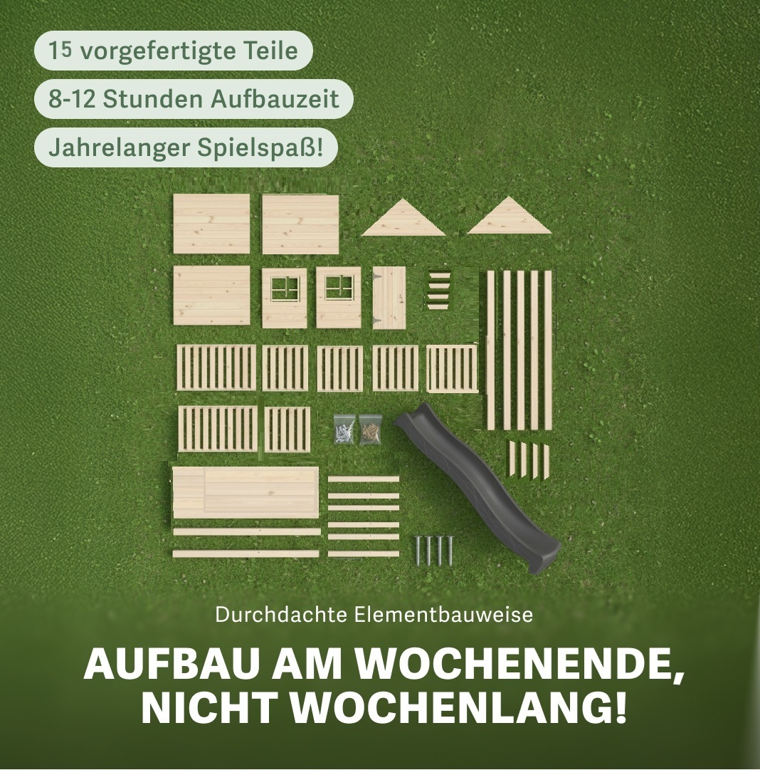 Allgemeine Warnhinweise! Das Spielgerät ist ausschließlich für den privaten Gebrauch im Freien bestimmt. Das Spielgerät eignet sich für Kinder im Alter von 3 - 14 Jahren. Eltern haben eine permanente Aufsichtspflicht, wenn Kinder an oder auf diesem Gerät spielen. Die angegebenen Maße und Farben können geringfügig abweichen. Technische Änderungen vorbehalten. Das Spielgerät benötigt von außen einen Holzschutzanstrich mit Imprägniergrund und geeigneter Farbe.