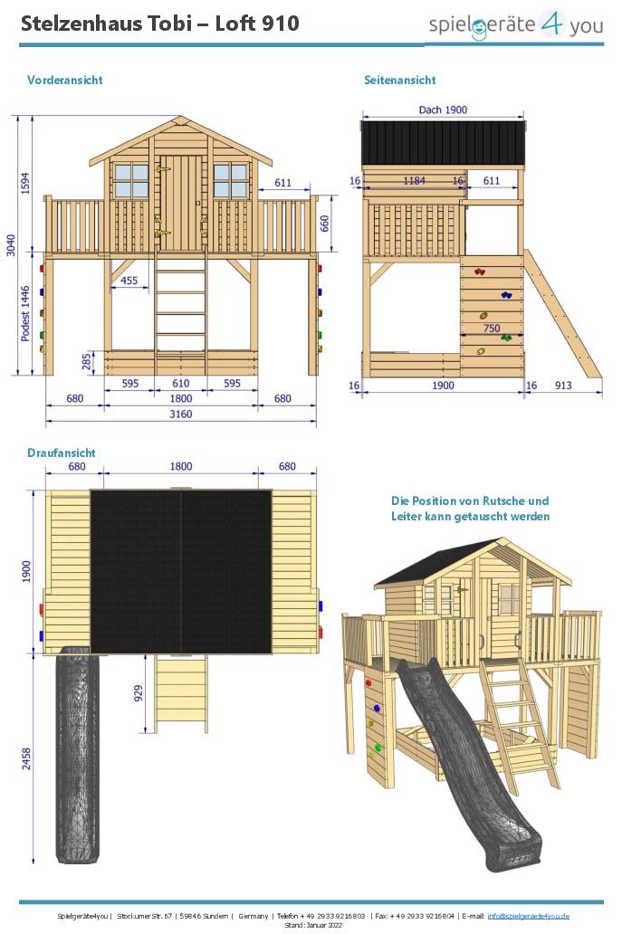 Stelzenhaus Tobi Loft 910 mit 2 Balkonen, 2 Kletterwänden und Rutsche