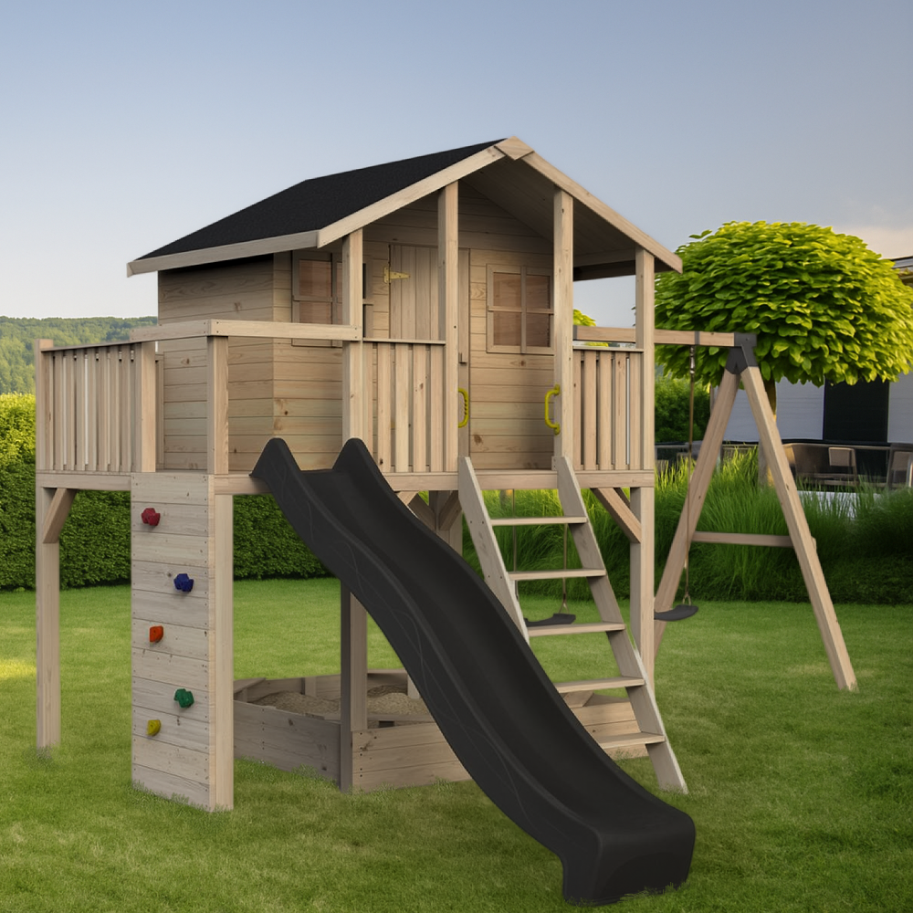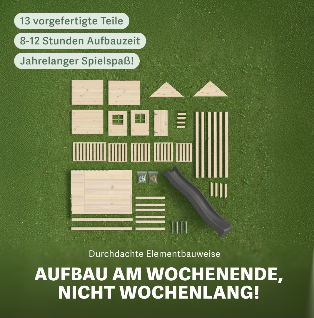 Es wird kostenlos geliefert, lässt sich dank der vorgefertigten Elemente schnell aufbauen und ist ein kompletter Spielplatz im eigenen Garten. Hier können sich die Kinder nach Herzenslust in der Spielwelt austoben. Die verschiedenen Möglichkeiten bieten viel Platz, ob an der Kletterwand, auf der Schaukel oder auf der Rutsche - der Spaß ist inklusive. Die große Podestfläche lädt zum sicheren Spielen ein und im Stelzenhaus ist viel Platz zum Träumen und Kuscheln. Die Spielwelt lässt keine Wünsche offen. Mit einer Podesthöhe von 150 cm sind die stabilen Stelzen sehr bequem. Die im Lieferumfang enthaltene Dachpappe schützt Ihr Dach und ist ein absolutes Muss für jedes Naturprodukt im Freien.
