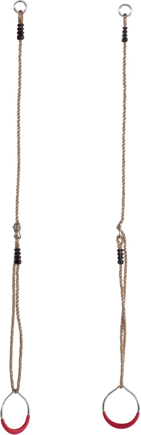 Mit diesen beiden Turnringen können sich Ihre Kinder schwungvoll in die Seile hängen und ihre Turnkunst zeigen oder erproben. Die Turnringe sind aus Metall gefertigt und mit roten Kusntstoffgriffen verkleidet. Sie werden zusammen mit dem witterungsbeständigen PH-Seilen geliefert und können ganz einfach in Ihre Schaukelschellen eingehangen werden.
