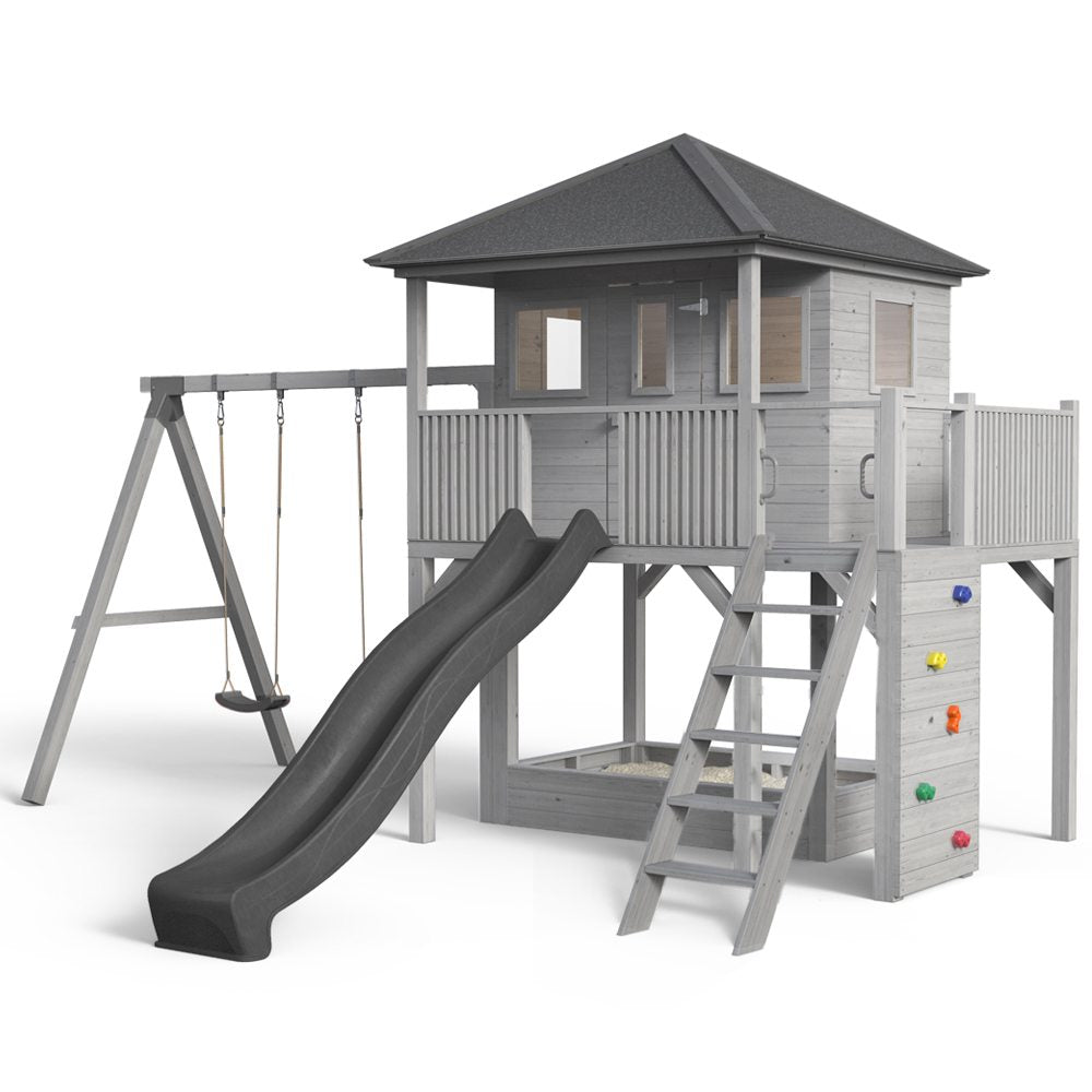 Dank der Kletterwand mit bunten Klettersteinen ist das Stelzenhaus auch ein Kletterturm, an dem kleine Entdeckerinnen und Entdecker neue Bewegungen lernen können. Auch kleinere Kinder können unsere Stelzenhäuser über die Treppe bzw. Kletterleiter erreichen. Nachdem das Stelzenhaus mit Balkon erobert wurde, können die Kinder über die Rutsche ganz schnell wieder nach unten gelangen, um im Sandkasten Sandburgen zu bauen oder in der Kids Lounge zu "chillen". Auf der stabilen Schaukel haben zwei Kinder gleichzeitig Platz zum Schaukeln. So wird aus einem Stelzenhaus ganz schnell ein ganzer Spielplatz.